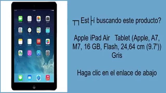 Apple iPad Air Tablet Apple, A7, M7, 16 GB, Flash, 24,64 cm 9.7' Gris http://bit.ly/23T2SQ2 Otras características: 2G: Si3G: Si4G: Si64-bit: SiAcelerómetro: SiAdaptador AC incluido: SiAirPlay: SiAltavoces incorporados: SiAltura: 24 cmAncho: 16,95 cmAuriculares: 3,5 mmAutoenfoque: SiAutonomía: 10hBluetooth: SiBrújula electrónica: SiCables incluidos: LightningCapacidad de almacenamiento interno: 16 GBColor del producto: GrisConector de iluminación: SiCoprocesador: SiCorreo electrónico: SiCámara frontal: SiCámara trasera: SiDensidad del pixel: 264 ppiDiagonal de la pantalla: 24,64 cm 9.7"Enlace de alta definición móvil MHL: NoEstabilizador de vídeo: SiEstándares 2G: EDGE, GSMEstándares 3G: EVDO, H