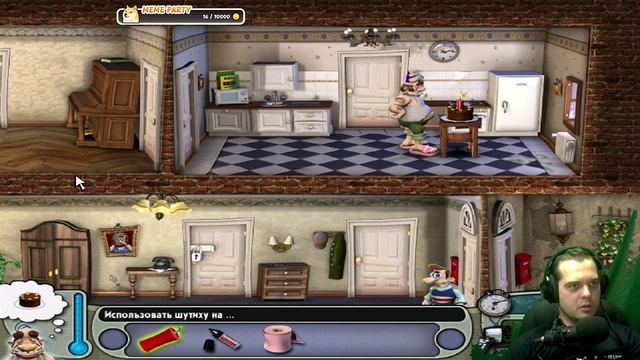 «Как достать соседа: Сладкая месть» (англ. Neighbours from Hell: Revenge is a Sweet Game) — компьютерная игра-аркада. Главной целью игры является отомстить соседу. Герою нужно находить предметы и использовать их, чтобы навредить соседу, не попадаясь при этом последнему на глаза. В одной игре присутствуют 14 эпизодов. Игра была выпущена для Windows в США 22 сентября 2003 года. 8 октября 2020 года на Windows, PlayStation 4, Xbox One и Nintendo Switch была выпущена ремастер-компиляция первых двух игр под названием Neighbours Back From Hell. Ремастер отличается повышенной частотой кадров, HD-графикой, а также улучшенным интерфейсом из консольной версии. Сюжет Действие игры разворачивается в Австрии в сентябре 1989 года. Вуди — обычный молодой человек, которому сосед мистер Ротвейлер многие годы не давал спокойно жить. Однажды в мятежный день, Вуди решил отомстить мистеру Ротвейлеру и вызвал телевизионную команду JoWooD Vienna TV во главе с режиссёром Джо, которая сняла реалити-шоу, показывающее отношения соседей с худшей стороны. Игровой процесс PC-версия В игре присутствует 14 эпизодов, разбитых на 3 сезона различной сложности, а перед ними — ещё и три пилотных учебных эпизода, позволяющие игроку научиться тонкостям игры. Первый сезон состоит из 6 эпизодов. В нём игроку доступны кухня, гостиная, холл и ванная. Во втором сезоне присутствуют только 4 эпизода, и игроку открываются спальня и балкон. Третий сезон, так же, как и второй, состоит из 4 эпизодов, игроку открываются кабинет и подвал. В каждом эпизоде игроку, управляя действиями Вуди (протагониста игры) с помощью левой кнопки мыши нужно обыскивать дом Соседа и находить в разных местах полезные предметы, причём среди этих предметов есть как уникальные, встречающиеся только в одной серии, так и те, что доступны игроку в нескольких сериях одного сезона или разных сезонов (примеры последних — чёрный маркер, сырое куриное яйцо, кусок мыла, рулон туалетной бумаги, тюбик суперклея, горсть канцелярских кнопок, банановая кожура, баллончик спрея для роста волос, коробочка чёрной ваксы для обуви, кусок электрического провода со штепселем, стеклянные шарики, плоскогубцы). В игре есть также предметы, которые подобрать нельзя, но тоже можно использовать для пакостей; к ним относятся антенна телевизора, подставка на колёсиках, зонтик, огнетушитель, утюг, скакалка, тряпка на водопроводной трубе, вентили водопровода и отопления и шлифовальная машина. Пакости с этими предметами срабатывают тогда, когда Сосед вступит с ними в прямой контакт. Почти все найденные игроком игровые предметы, как правило, в течение всего эпизода могут быть использованы только один раз (единственные исключения присутствуют лишь в эпизодах «Футбольные баталии» и «Сезон охоты»). Причём многие из этих пакостей (например, подпиливание ножки кресла или бросание банановой кожуры на пол) в реальной жизни способны причинить сильный вред имуществу и здоровью, иногда с летальным исходом. а может попытаться заработать все сто процентов. После прохождения всех эпизодов в сезоне Вуди получает в награду статуэтку Соседа. В зависимости от зрительских рейтингов она может быть бронзовой, серебряной или золотой. Если игрок прошёл сезон на самый минимальный рейтинг, то он не получает статуэтку. https://www.donationalerts.com/r/sancho_shahid https://memealerts.com/66d08abbdcdea5ef8888a72d https://live.vkplay.ru/sancho_shahid https://rutube.ru/channel/996059/ https://trovo.live/s/Sancho-shahid/215699970 П