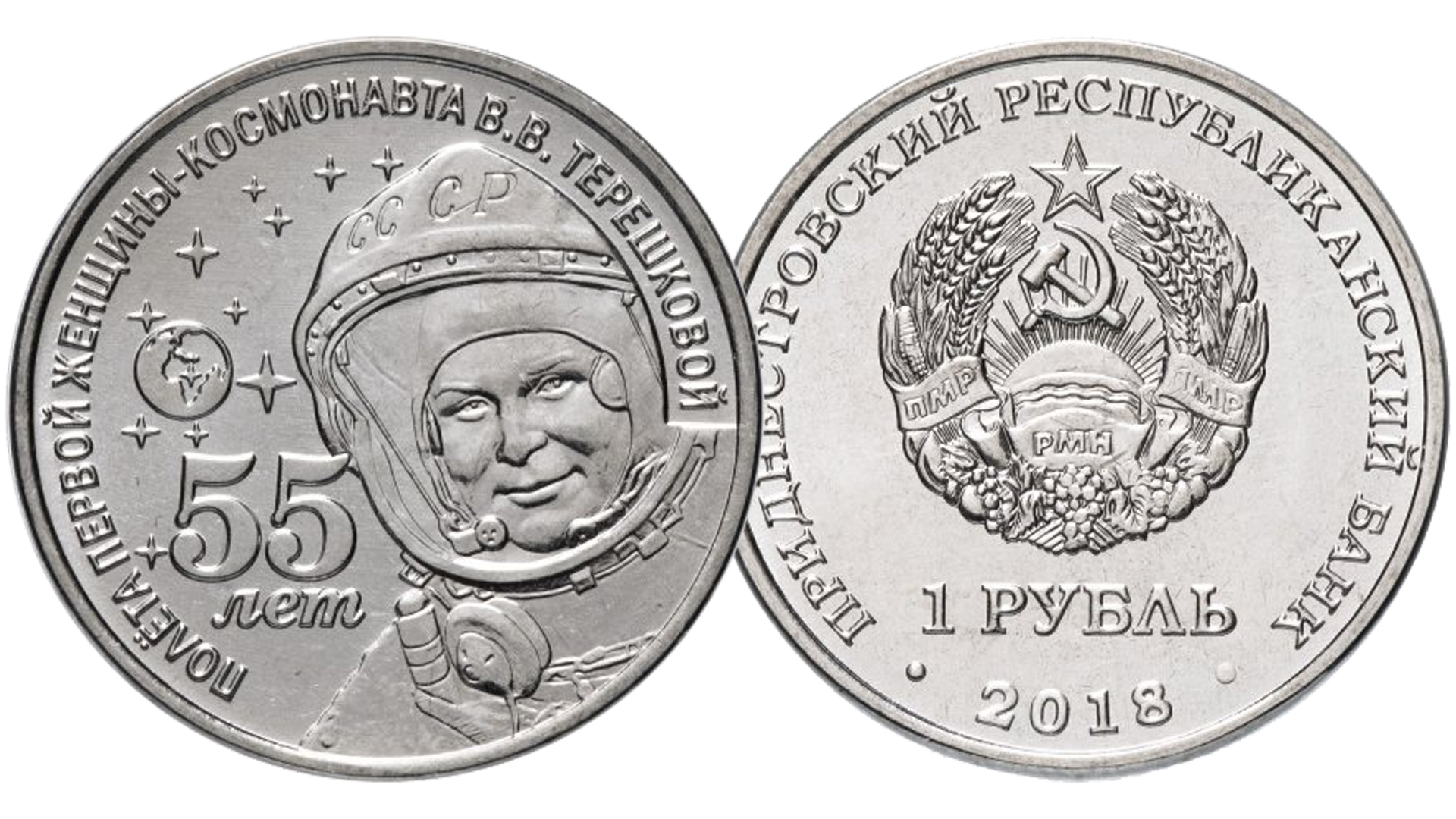 1 рубль Приднестровья 55 лет полета первой женщины космонавта В.В. Терешковой.