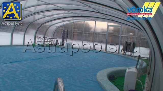 На видео представлен раздвижной павильон для бассейна модель «Prestige» от Voeroka Германия. Павильон был установлен на бассейн в 2011 году. Размеры павильона длина 11 метров ширина 9 метров. Количество передвижных секций пять. Каркас конструкции собран из алюминиевых профилей с надежной защитой от внешнего воздействия и окисления, нанесено защитно-декоративное покрытие методом анодирования. Остекление конструкции восьмимиллиметровый сотовый поликарбонат. Съемки видео происходили зимой в московской области 27 января 2013 года. Температура воздуха на улице минус 16 градусов. Внутри павильона в режиме ожидания поддерживается температура плюс 17 градусов. Павильон оснащен подъемными дверьми вверх в общем количестве два комплекта, на видео демонстративно показано, каков принцип работы одной из этих дверей. В одной из торцевых стен встроена одинарная распашная дверь шириной пролета один метр высотой 2 метра. Компания АстраПулс работает в отрасли строительства бассейнов с 2000 года и обладает большим практическим опытом, что гарантирует качественный конечный результат клиентам. Официальный сайт компании Voeroka http://Voeroka.de E-mail: Voeroka@gmail.com Официальный сайт представителя в России http://astrapools.ru pool@astrapools.ru