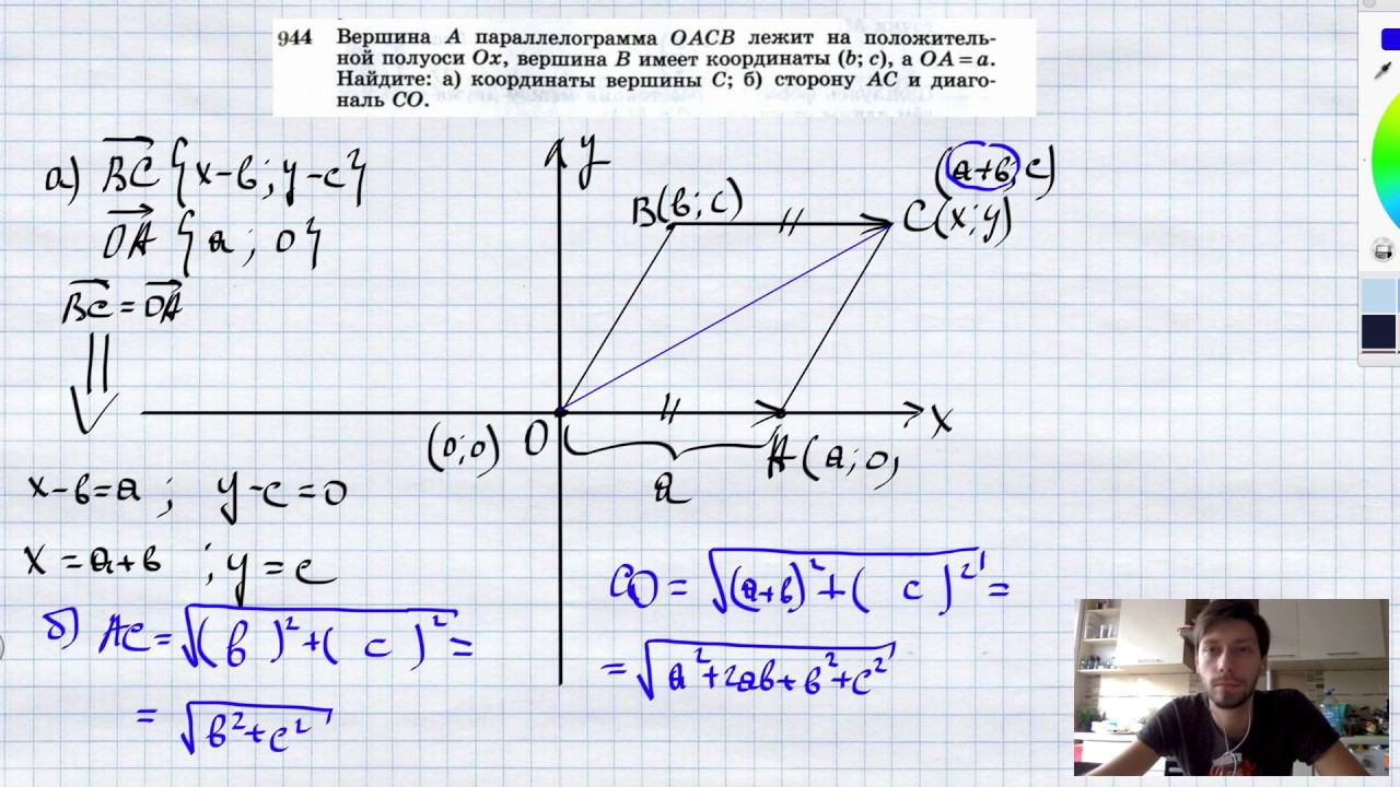№944. Вершина А параллелограмма ОАСВ лежит на положительной полуоси Ох, вершина В имеет координаты (b; с), а ОА=а. Найдите: а) координаты вершины С; б) сторону АС и диагональ СО. Поддержать канал рублём - 5469400944002125 (Сбербанк) Мой второй канал для подготовки к ЕГЭ и ОГЭ - https://www.youtube.com/ЕвгенийСумин Инстаграм - https://www.instagram.com/EGE_OGE.math Личный инстаграм - https://www.instagram.com/ee_sumin VK - https://vk.com/evgeniysumin FB - https://www.facebook.com/EvgeniySumin