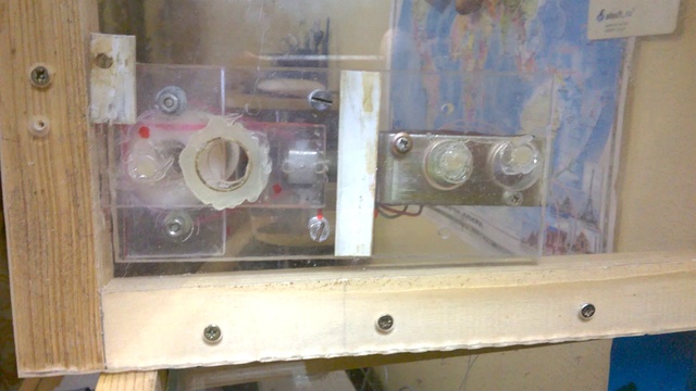 Новая автоматическая кормушка для аквариума на соленоиде (вид снизу). В штоке отверстие-дозатор. В дозатор наполняется кормом из кормушки под собственным весом. Корм соленоидом перемещается в аквариум. Достоинство кормушки в том, что она герметичная и корм не отсыревает и не слипается.