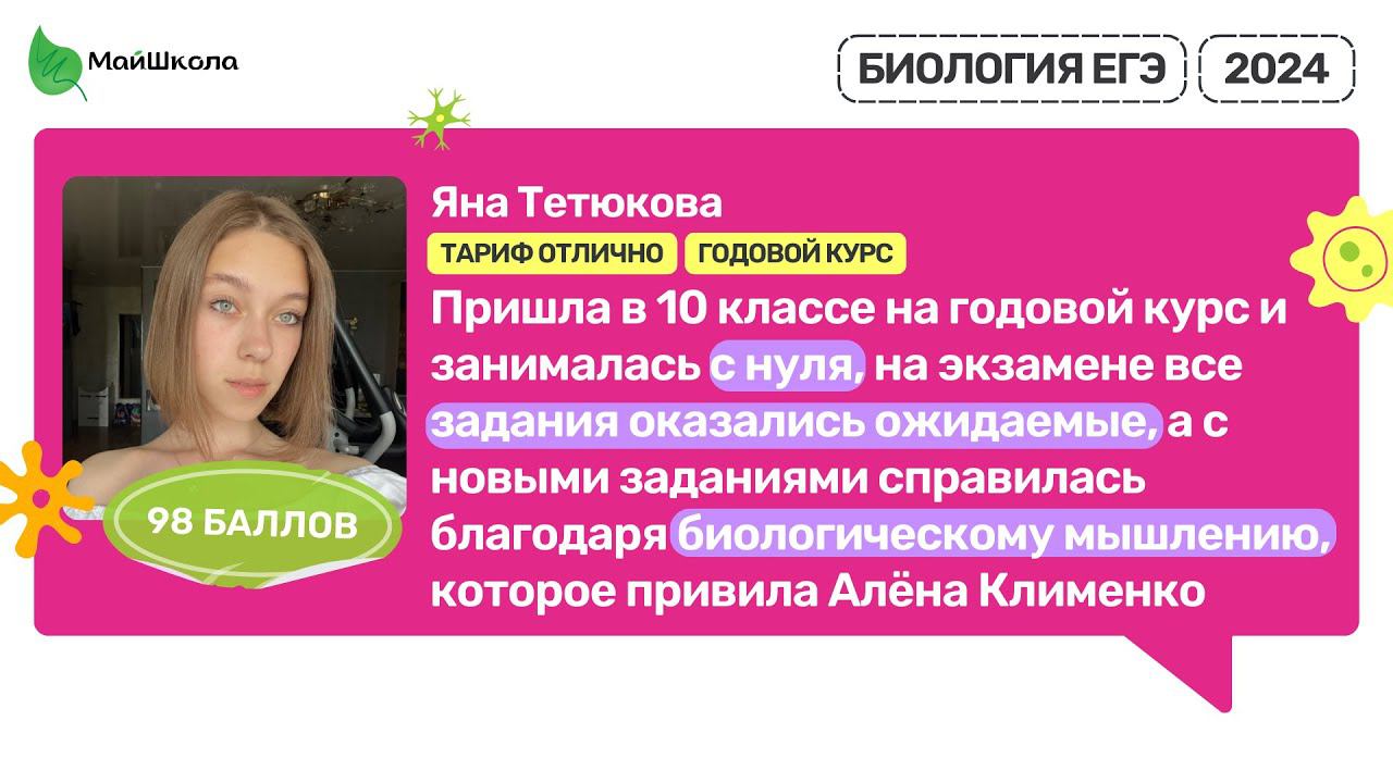 Отзыв Яна Тетюкова 98 баллов ЕГЭ 2024 | Майшкола #егэ #биология Записывайся на актуальные курсы подготовки к ЕГЭ по Биологии здесь: https://clck.ru/359pZ9 МайШкола это: - Опытные преподаватели, которые в совершенстве знают структуру ЕГЭ и каждый год сдают ЕГЭ по своему предмету, чтобы почувствовать себя на месте ученика - У нас авторская программа подготовки, показавшая свою эффективность на результатах ЕГЭ более 3000 учеников - 80 – средний балл учеников на ЕГЭ по Биологии Подписывайся на канал, чтобы не пропустить новые видео и эфиры! https://www.youtube.com/channel/UCq4KDNX4OsLFoOGQjePYWOA?sub_confirmation=1 ► Инстаграм Алены: https://www.instagram.com/alenabiology ► Телеграм-канал: https://t.me/alenabio ► Группа ВК: https://vk.com/public67153074