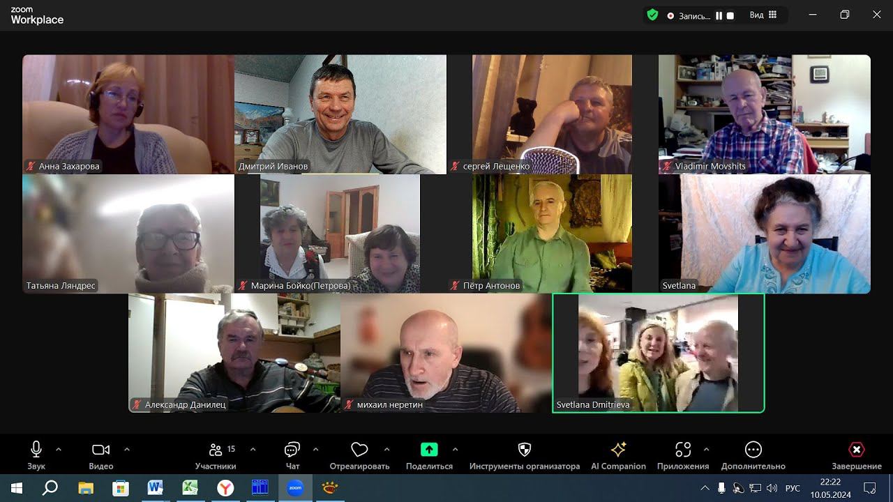 Поём песни Победы и Булата Окуджавы 0:00:00 Вступление 0:01:28 Марина Бойко, Галина Михайловна, Артём Бойко, Дмитрий Иванов 0:04:32 Светлана Бабицкая 0:15:49 Марина Бойко, Галина Михайловна, Артём Бойко 0:23:40 Пётр Антонов 0:32:55 Анна Захарова 0:41:28 Владимир Мовшиц о песне "Тёмная ночь" 0:43:37 Александр Данилец 0:51:28 Сергей Лещенко 0:56:25 Алёна Шабес 1:03:56 Владимир Кузнецов 1:11:03 Михаил Неретин 1:16:56 Татьяна Ляндрес 1:26:39 Дмитрий Иванов 1:35:27 минута молчания 1:36:26 Татьяна Беззубкина 1:38:32 Светлана Бабицкая 1:47:26 Светлана Дмитриева и компания (с фестиваля "Песня Булата") 1:53:20 Марина Бойко, Галина Михайловна 2:00:38 Пётр Антонов 2:07:21 Лариса Смирнова 2:16:52 Анна Захарова 2:22:47 Александр Данилец 2:25:20 Сергей Лещенко 2:27:25 Михаил Неретин 2:30:39 Дмитрий Иванов