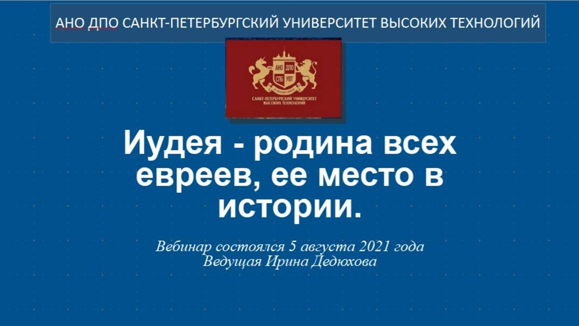Иудея — родина всех евреев, ее место в истории (2021) Пятый вебинар Книжной лавки на эту тему состоялся 5.08.2021 г. Ведущая Ирина Дедюхова Читать/смотреть по теме: Иудея — родина всех евреев, ее место в истории https://ogurcova-portal.com/iudeya-rodina-vseh-evreev-ee-mesto-v-istorii/ (2015/2018/2020/2021) Первый вебинар 2015 года - https://rutube.ru/video/d933883b93d39b2b1942136250f21585/ Второй вебинар 2015 года - https://rutube.ru/video/23342ec888ac80ef90f5cb8fb0c43725/ Третий вебинар 2018 года - https://rutube.ru/video/80c1f7d4eb0550901480dd33d88f1eb5/ Четвертый вебинар 2020 года - Источники: Научно-технический портал «Технарь» https://ogurcova-online.com/ "Книжная лавка" https://ogurcova-portal.com/ "Литературное обозрение" https://litobozrenie.com/ Правообладатель: АНО ДПО СПБ УВТ - Санкт-Петербургский университет высоких технологий https://univer.spb.ru/svedeniya-ob-obrazovatelnoj-organizaczii/ https://univer.spb.ru/edinaya-obrazovatelnaya-sreda-universiteta-vysokih-tehnologij/