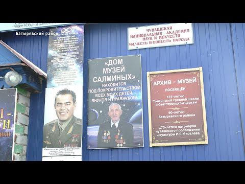 Житель села Тойси, Батыревского района, Валерий Салмин собрал немалую коллекцию: труды по астрономии, физике и философии. Вот уже более пяти лет Валерий Иванович знакомит с космосом всех желающих. В гостях побывала и наша съёмочная группа. «Идея создать собственный дом-музей зародилась ещё в детстве», – отмечает Валерий Салмин. Уже в школьные годы он проектировал парашюты, аэросани. И всё это время любовь к небу только усиливалась. Как результат – целый дом, заполненный фотографиями, книгами и плакатами. ВАЛЕРИЙ САЛМИН: «Я сам всё делаю, сам пишу, сам постановщик, сам автор всего этого». Валерий Иванович – заслуженный экономист, народный академик, ветеран труда. В свои 70 лет он и не думает стареть. Посмотреть на его многолетнюю коллекцию приезжают школьники и целые семьи из других районов Чувашии. ВАЛЕРИЙ САЛМИН: «Знания были и остаются силой. Это своего рода дом посвящения. Я хочу, чтобы молодёжь стремилась в небо, в космос. Надо учиться, работать и заниматься спортом». Валерий Иванович хочет передать подрастающему поколению свои знания. И то, что он уже собрал – далеко не предел. Анна Цинтовская, Юлия Адюкова, Николай Скворцов, Республика