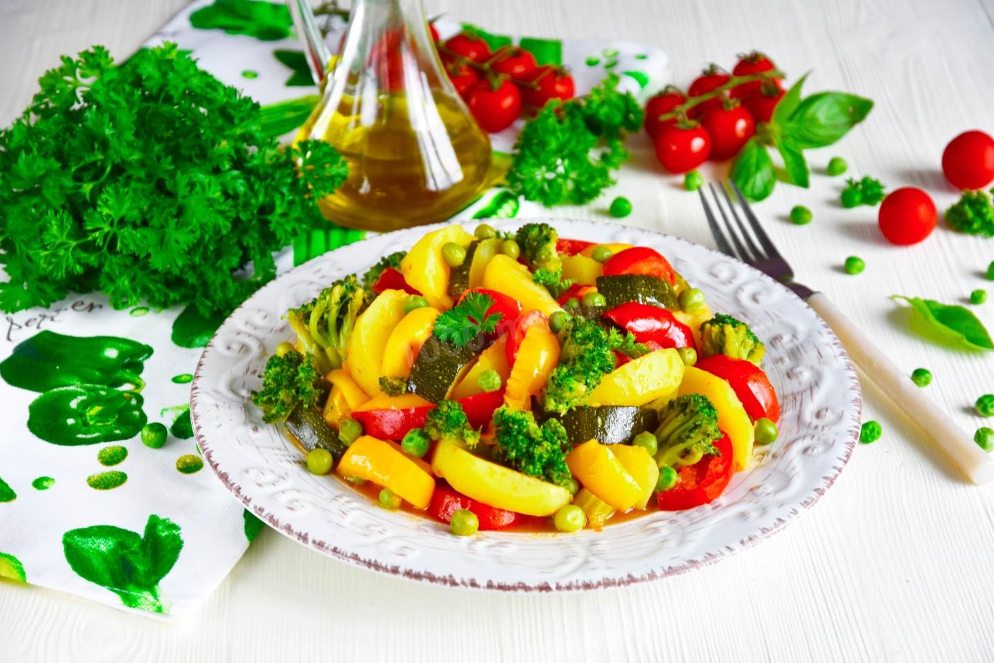 Картошка 500 гр Цукини 300 гр Помидоры 150 гр Вода 150 мл Брокколи 100 гр Стебель сельдерея 1 шт. Зелёный горошек 50 гр Болгарский перец 2 шт. Растительное масло 3 стол.л. Томатная паста 1 стол.л. Перец черный молотый по вкусу Соль по вкусу