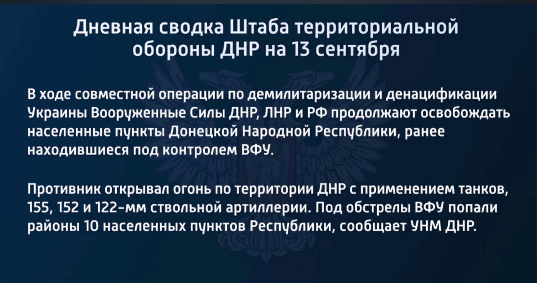 Дневная сводка Штаба территориальной обороны ДНР на 13 сентября 2022 года