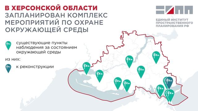 Единый институт пространственного планирования РФ в рамках разработки мастер-плана Херсонской области (https://t.me/VGA_Kherson) определил ключевые мероприятия по охране окружающей среды, направленные на эколого-ориентированное развитие территории. Мастер-планом предусмотрена реконструкция 12 административных зданий Роспотребнадзора, а также модернизация системы наблюдений за состоянием окружающей среды, которая включает в себя строительство двух новых пунктов наблюдения, ликвидацию метеорологической станции и реконструкцию одного гидрологического поста. Это позволит получать актуальную информацию о загрязнении окружающей среды для принятия оперативных решений по нивелированию негативного воздействия и улучшению качества жизни населения. Кроме того, в Херсонской области предлагается провести модернизацию системы обращения с отходами, в рамках которой планируется вывести из эксплуатации 16 полигонов ТКО и построить три комплексных объекта по обращению с отходами в Алешкинском, Каховском и Геническом муниципальных округах. Данные меры позволят обеспечить стопроцентную сортировку ТКО и двукратное снижение объемов их захоронения на территории области. Также в планах – ликвидация трех объектов накопленного вреда в Скадовском, Чаплинском (https://t.me/chaplinka_vga) и Геническом муниципальных округах в целях предотвращения значительного урона экологическому благополучию территории.