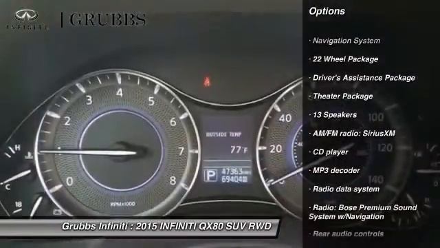 http://grubbsINFINITI.vidmagnet.com/ava/apps/vsp.php?vehicle_fkey=DA1BD45C-069D-1603-4609-FCF0F134C9F0 New and Used INFINITI car and SUV dealership serving the Dallas and Fort Worth area. Grubbs INFINITI provides car loans, and service and parts to keep your INFINITI in top condition. New http://INFINITI.grubbs.com/new/INFINITI/2015-INFINITI-Q40-44aa066c0a0e0ae81b7120961755c412.htm?stock=F9572532 Pre Owned http://INFINITI.grubbs.com/used/INFINITI/2010-INFINITI-EX35-33db30610a0e0ae75794636b074a615b.htm?stock=F9572532 2015 INFINITI QX80 http://INFINITI.grubbs.com For more information on this vehicle and our full inventory, call us at (888) 447-8227 Grubbs INFINITI 1500 E State Highway 114 Grapevine TX 76051 22 Wheel Package, Driver's Assistance Package (Backup Collision Intervention (BCI), Blind Spot Warning, Intelligent Brake Assist (IBA), and Intelligent Cruise Control (Full-Speed Range)), Theater Package (120V Power Outlet, Dual 7 Color Monitors, Heated 2nd-Row Seats, and Wireless Headphones (2)), and Navigation System. Come take a look at the deal we have on this fantastic-looking 2015 INFINITI QX80. When you say quality, INFINITI comes immediately to mind, and this INFINITI QX80 is no exception.
