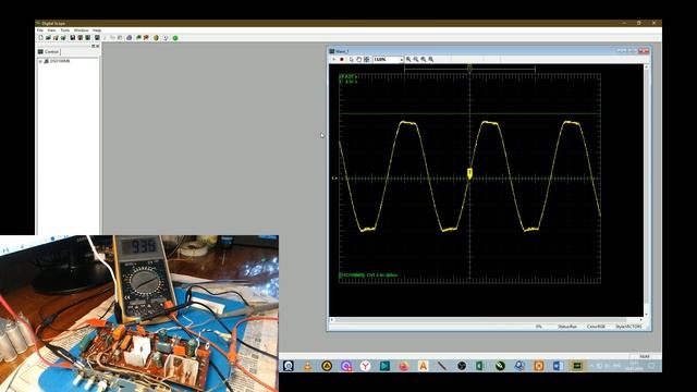 Подключил УНЧ радиоприемника Океана-214 к нагрузке в 6 Ом. Подал на него питающее напряжение в 9 В. На вход подключил генератор НЧ и установил частоту в 1 кГц. К нагрузке подключил осциллограф. И теперь вместе с вами будем исследовать УНЧ после замены конденсаторов. Смотреть искажения при разных напряжениях питания.