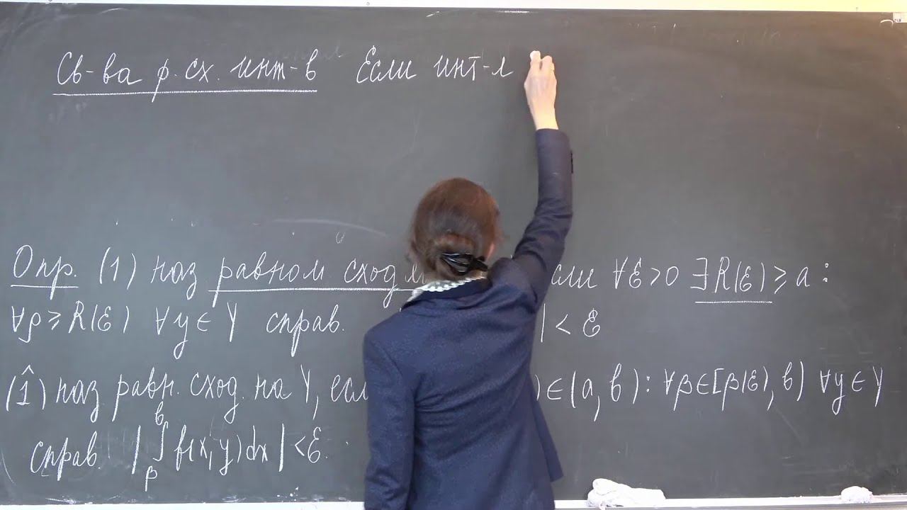 00:00 — Начало 02:42 — Вспомогательная лемма 09:50 — Теорема о непрерывности несобственных интегралов, зависящих от параметра 16:42 — Признак Дини 29:12 — Теорема о дифференцируемости несобственных интегралов,зависящих от параметра 42:16 — Теорема о собственном интегрировании несобственных интегралов,зависящих от параметра 57:16 — Следствие 1:02:52 — Теорема о несобственном интегрировании несобственных интегралов,зависящих от параметра