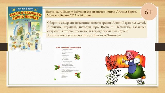 Уважаемые взрослые и юные читатели! Предлагаем вашему вниманию виртуальную выставку информационных материалов «В мире детства с Агнией Барто», посвященную 120-летию со дня рождения детской поэтессы. Творчество Агнии Львовны неоценимо для восприятия детства. Потому что, едва научившись говорить, каждый российский ребенок рассказывает окружающим историю о бычке, который вот- вот упадет, о зайке, брошенном хозяйкой, и о Тане, уронившей в речку мячик. С этими стихами мы встречаемся в жизни дважды. Первый раз, когда с восторгом слышим их от пап и мам, и второй раз - когда уже сами читаем детям. Тонкой, едва заметной ниточкой проходят эти строки сквозь нашу жизнь, крепко связывая поколения и оставляя в душе светлый след памяти о детстве… На выставке представлены произведения Агнии Барто, изданные в разные годы и знакомые всем с детства.