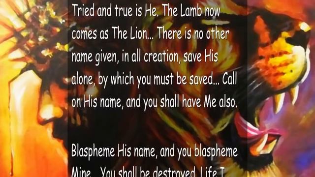 Sons, daughters and concubines of Satan...The Lord say...you shall be in the lake that burns forever Harken, My people... My kingdom comes, The Son returns. Hear Me!... I am The Great I AM... Before the earth was, I AM... Before there was light, I AM...Before life was, I AM. I am before all things, and will be after all things. All created are of Me and abide in Me... There is nothing that is, that is not from Me... Nor anything created, not created by Me. Even all the things of men, created by their hands, are not created, unless He who has created them, their Maker, did give unto them this power and this wisdom to create... Still all man’s creations are but dust in the wind. They only stand, because it is The Lord’s will that they should stand. Soon all will crumble and be brought low, for the Deliverer comes, and He will also destroy. Salvation comes to those at His right hand; judgment and death to those at His left. Oh peoples planted in the stony ground, be uprooted and planted in the good soil at His right, and drink. For even He, who is, and was, and yet is forevermore, was seated at the right hand of The Father from the beginning... At no time was He not, for as I am, He is. He is The Sower and The Harvester... He is also He who will uproot the weeds. Let Him plant a new seed in your heart, and join Him in the Garden... Do not be burned or cast away. Oh peoples of My earth, hear also those who speak for Me, for he who speaks My words has authority, for the Word of God carries great authority. Listen, oh peoples!... Then kneel, bow down, humble yourself before your God. Do not wait until all are brought low, by the mighty hand of He whose name is above all names... Tried and true is He. The Lamb now comes as The Lion... There is no other name given, in all creation, save His alone, by which you must be saved... Call on His name, and you shall have Me also. Blaspheme His name, and you blaspheme Mine... You shall be destroyed. Life I give... And I shall take it away, unless you repent. There is no life in death... All sleep forever, unless The Son calls you to awake. Fear not, I do not punish eternally that which I have created and given My image. Those, who will not return to their Father, and have become the sons, daughters and concubines of satan, to them will The Lord say, “Dust to dust. No more shall you partake of the Tree of Life or the river therein. You have forsaken He who has given to you freely, and forevermore is your inheritance lost and given to another.” Oh mourning, great mourning in all the land, My beloved have become a sore and a sickness. I have sent The Healer... You would not have Him, nor drink of His cup freely offered. So you shall be with your adopted father, in the lake that burns forever, and be no more. Rest, oh My beloved who have become mortally ill. Rest, all you wicked, evil has wearied you... Rest forevermore. Your light has gone out, and you have been blotted out.