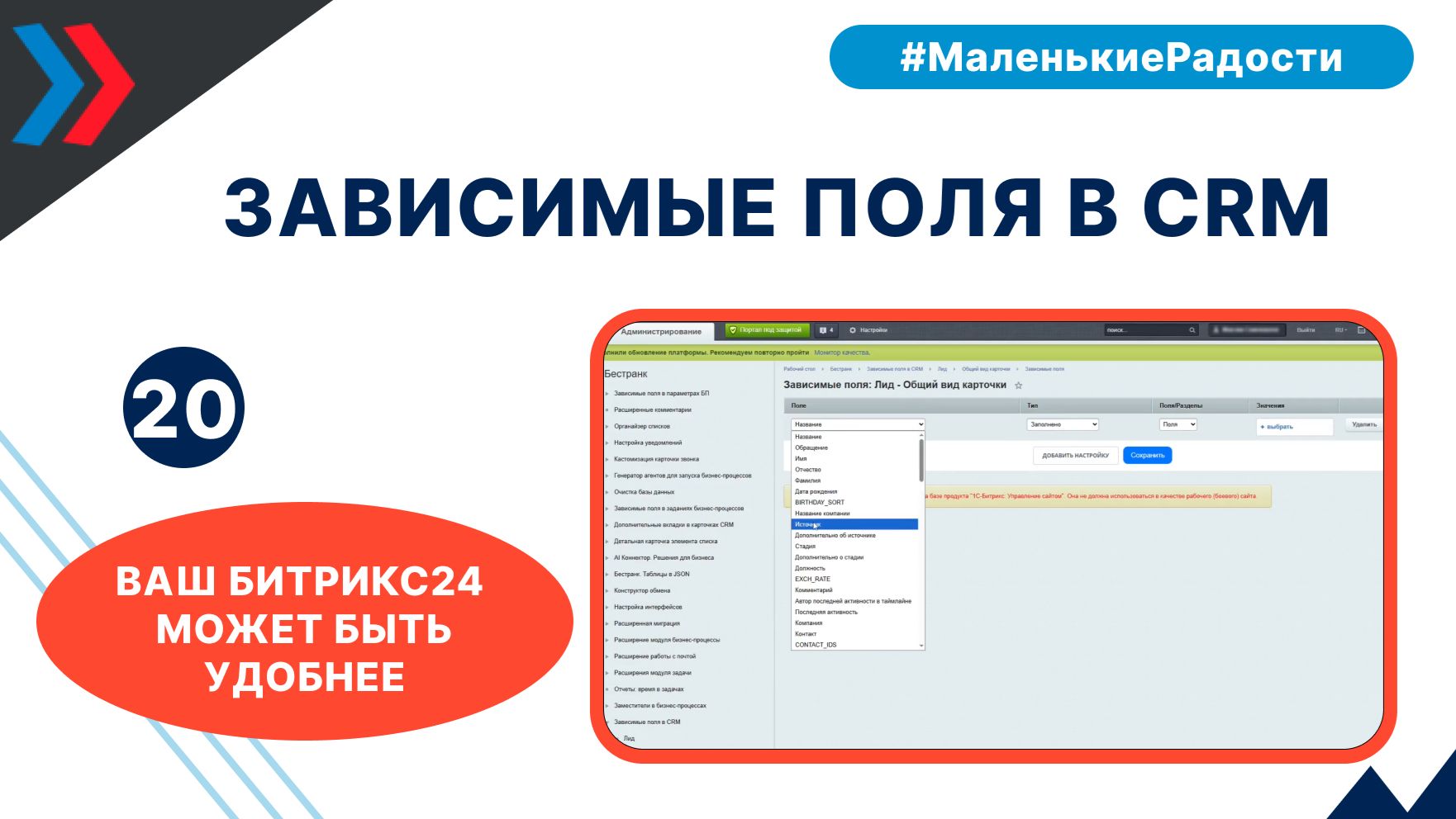 Зависимые поля в CRM - это модуль, который позволяет настраивать зависимости показа одних полей от заполненности/значения в других полях. Ненужные при определенных сценариях работы поля будут скрыты, и это делает работу с элементами CRM намного более удобной.