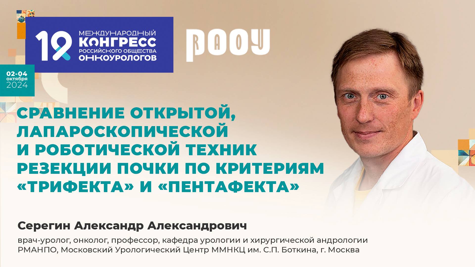 3 октября на XIX Международном Конгрессе РООУ Серегин А. А представил доклад на тему: "Сравнение открытой лапароскопической и роботической техник резекции почки по критериям «трифекта» и «пентафекта»". ✅ Эксперт: Серегин Александр Александрович, врач-уролог, онколог, профессор, кафедра урологии и хирургической андрологии РМАНПО, Московский Урологический Центр ММНКЦ им. С.П. Боткина, г. Москва. ❗ ➡️ Официальный сайт РООУ: https://roou.ru/ Присоединяйтесь к нам в социальных сетях. Делитесь мнением и повышайте уровень теоретической и практической подготовки в онкоурологии: Telegram: https://t.me/oncologyurology ВКонтакте: https://vk.com/oncologyurology