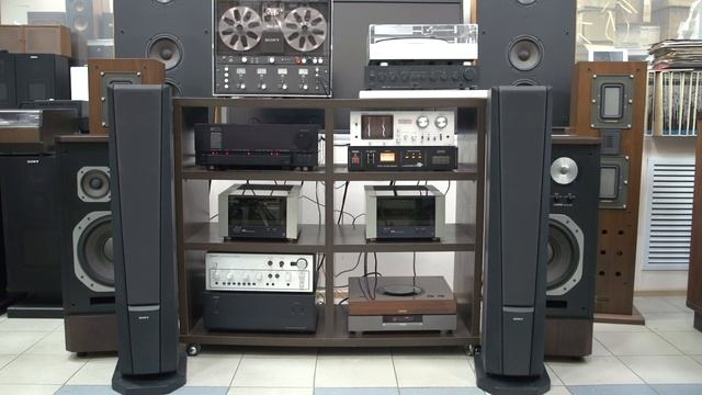 SONY SS-GT880 ¥100,000(2台1組、1995年発売) Редкие, напольные акустические системы. Трёх полосные с дополнительным пассивным излучателем для глубокого воспроизведения низкочастотного спектра. Разборчивое звучание с хорошей детализацией. Интересный низ, местами (зависит от записи) удивляет его глубина. На заднем плане катушечный профессиональный аппарат SONY DFR- 3415W. 大画面映像に合わせてリアルな音場と臨場感を追求したトールボーイ型スピーカーシステム。 低域には16cmコーン型ウーファーと15x23cmのパッシブラジエーターを搭載しており、スリムサイズで低音再生能力を確保しています。 中域には12cmのコーン型ミッドレンジを搭載しています。 高域にはソニー独自のCD(Constant Directivity)ホーンと2.5cmドーム型トゥイーターを搭載しています。 CDホーンは広い指向性を持つドーム型トゥイーターの前面にショートホーンを設けた構造となっており、短径(上下)方向の指向性を鋭くし、長径(左右)方向であらかじめ決められた放射角に対して良好な指向性を得ています。 また、ホーンネック部を楕円形状にして振動板に音響的な制約を加えることで歪を低減し、レスポンスに優れた音を実現しています。 AV用途での用途を考慮した防磁設計となっています。 方式 3ウェイ・3スピーカー・パッシブラジエーター方式 ・トールボーイ型・防磁設計 ユニット 低域用:16cmコーン型 中域用:12cmコーン型 高域用:2.5cmドーム型+CDホーン パッシブラジエーター:15x23cm 再生周波数帯域 40Hz~30kHz 出力音圧レベル 89dB/W/m インピーダンス 6Ω 定格最大入力 60W 瞬間最大入力 180W クロスオーバー周波数 150Hz、2.5kHz 外形寸法 幅205x高さ1080x奥行300mm 台座・グリルを含む寸法:幅265x奥行365mm 重量 15kg