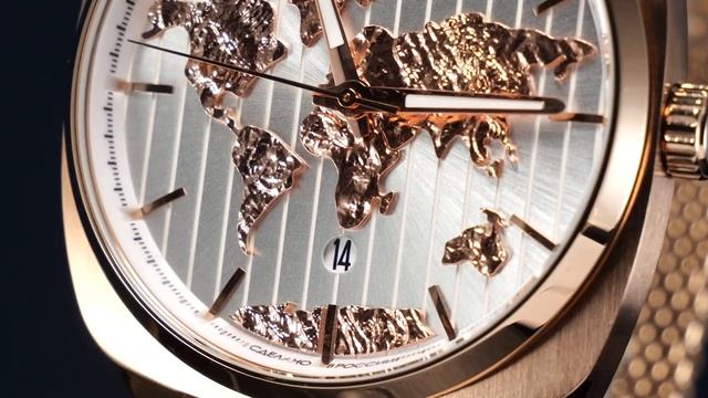 Форма корпуса часов, квадрат со сглаженными углами — это отсылка к моделям прошлых лет. Корпус сделан из нержавеющей стали с PVD-покрытием из розового золота, часть с зеркальной полировкой, часть с матированием. Тонкий безель напоминает иллюминатор космического аппарата, сквозь который космонавт наблюдает за величественной планетой Земля: очертания континентов украшают белый циферблат. На фоне этих рельефных накладных элементов движутся три стрелки. Часовая и минутная покрыты специальным люминесцентным составом, который в темноте светится приятным зеленоватым светом, позволяя определять время при любых условиях видимости. На 6 часах расположено лаконичное окошко даты. Вертикальные полосы гильоше усиливают эффект объема. Накладные риски выделены зеркальной полировкой. Циферблат защищен с помощью минерального стекла. Задняя крышка корпуса прозрачная. Такое решение позволяет в подробностях рассмотреть механизм TMI с функцией автоподзавода: его ротор украшает надпись «Сделано в России» и гравировка, изображающая космонавта. Задняя крышка крепится на четырех винтах, обеспечивая повышенную водостойкость 10 атмосфер (100 метров). Часы установлены на миланский браслет из нержавеющей стали, застежка с логотипом бренда поможет самостоятельно регулировать длину браслета. Заводная головка, застежка и ремешок украшены фирменным логотипом. Модельный ряд серии ЦУП можно посмотреть по ссылке: https://cosmos-watches.ru/catalog/watch/19101/