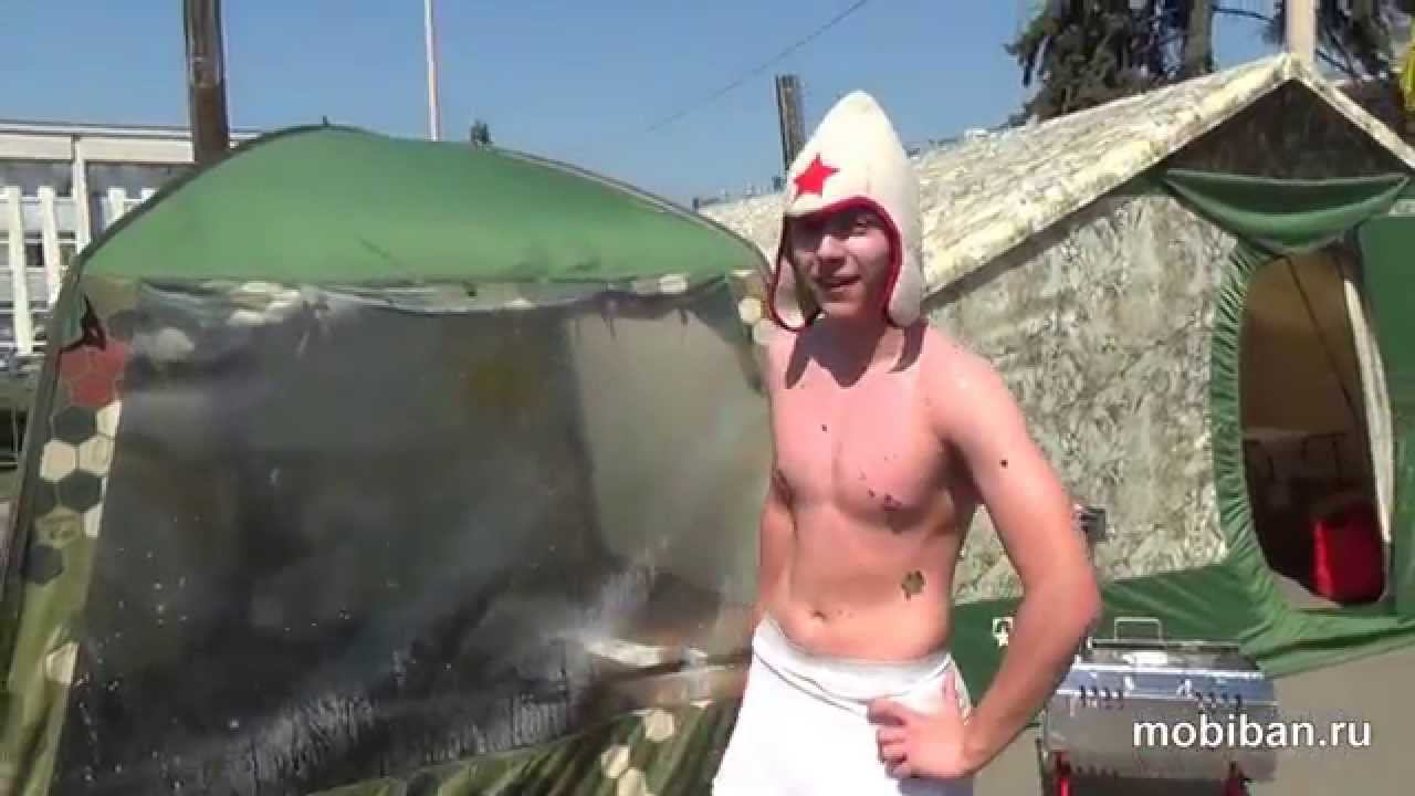 http://mobiban.ru/mb-10.php Мобильная баня Мобиба МБ-10. Если у вас отключили горячую воду или вы подолгу проводите время на даче, ходите в походы, на рыбалку, на охоту, то данный портативный вариант мобильной бани имеет смысл рассмотреть! Здесь на выставке молодые ребята тестируют походный вариант бани, помещаются туда вчетвером и орудуют вениками. Дубовый запах распространяется по всему переулку на выставке, начинаем хулиганить. :)