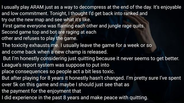 From ruining his relationships and studies due to extreme hours of playing League, to actually HURTING himself due to getting permabanned, here are some chilling REAL LIFE stories from Reddit. WATCH until the END because we'll find many experiences and desicions that may change your perspective or haunt you. I'm making a series about real stories of tragedies and experiences that LoL gamers feel. LoL confessions,issues and serious topics, we will discuss them all so stay tuned for the next video and subscribe you'll be notified first! Share this video to your friends who might experience the same in the video! #askreddit #reddit #redditposts #redditcomments #redditconfessions #reddittexttospeech #rleagueoflegends #LoLreddit Similar Video: League Players Share Their Addiction Story https://youtu.be/lVecNrqWiws ============================ About The Channel: Random but interesting Videos about League of Legends,Mobile Legends,and Legends of Runeterra. Parodies,Stories Compilations, and Memes Compilations, Text to speech content is my thing lol