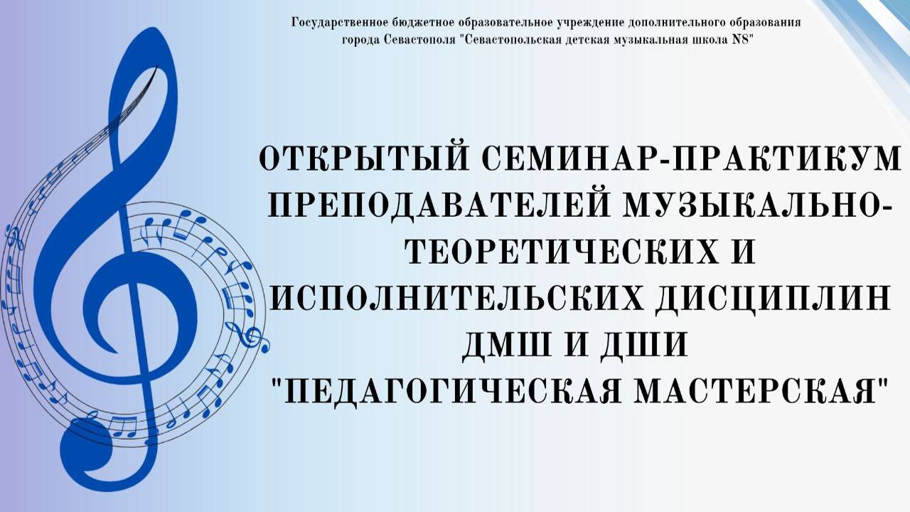 Открытый семинар–практикум преподавателей музыкально-теоретических и исполнительских дисциплин ДМШ и ДШИ «Педагогическая мастерская». Семинар-практикум проводится в виде демонстрации открытого урока (видеоурока) преподавателей по одному из предметов программы ДМШ и ДШИ (сольфеджио, музыкальная литература, слушание музыки, хор, инструментальное исполнительство, художественное искусство и.т.д) или выступление с методическим сообщением по тематике семинара. Цель семинара – обмен передовым опытом работы преподавателей музыкально-теоретических и исполнительских дисциплин. Мероприятие проходит в очно-заочном формате, в котором принимают участие преподаватели ДМШ и ДШИ из г.Донецк, Мариуполь, г.Горловка, г.Севастополь. В данном видео представлены выступления: 1. Сибирцева Лариса Дмитриевна - преподаватель музыкально-теоретических дисциплин МБУДО "Музыкальная школа №1 им.Н.Леонтовича г.Донецка". Тема выступления: "Музыкально-теоретические дисциплины в контексте современных проблем". 2. Глянцева Наталья Константиновна - преподаватель музыкально-теоретических дисциплин МБУДО ГО Горловка "Детская музыкальная школа №1". Тема выступления: Открытый урок по элементарной теории музыки "Изучение аккордов на уроках элементарной теории музыки". 3. Сидорова Елена Анатольевна - преподаватель изобразительного искусства МБУ ДО «Центральная школа искусств», г. Мариуполь; Профатилова Светлана Ивановна - преподаватель теоретических дисциплин ГБОУДОГС «Севастопольская детская музыкальная школа №8». Тема выступления: "Интегрированные уроки музыки и живописи, как метод создания расширенного восприятия видов искусства и раскрытия творческого потенциала ребенка".