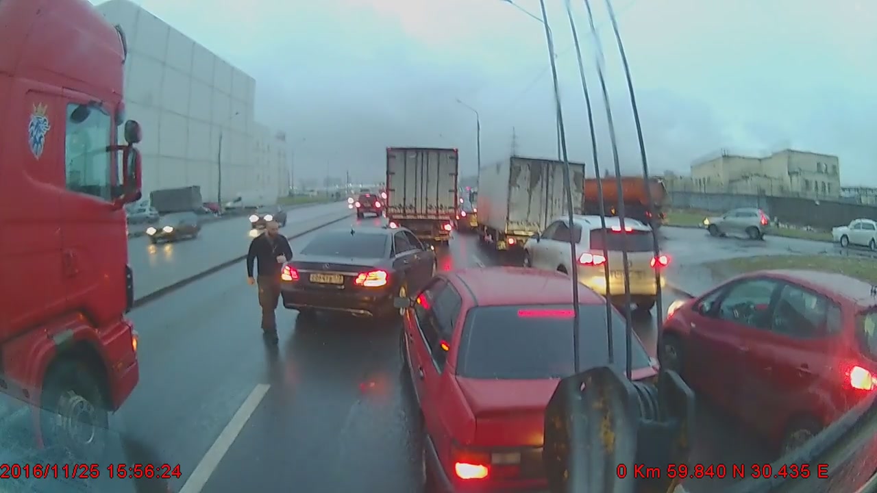 Мужик на Мерседесе решил наказать водителя старенькой иномарки, который влез в полосу раньше него.