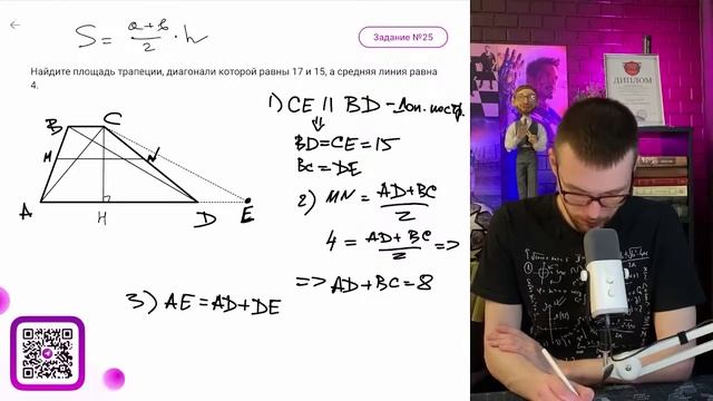 Найдите площадь трапеции, диагонали которой равны 17 и 15, а средняя линия равна 4. - №12165