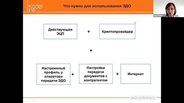 Компания «Кодерлайн» провела вебинар «Электронный Документооборот (подробно о неизбежном)» Ведущая: Ненашева Мария Андреевна - эксперт в области ЭЦП и ЭДО Целевая аудитория специалисты по документообороту, руководители организаций и подразделений. Описание Цель вебинара - раскрыть понятия Электронно-Цифровой подписи и Электронного Документооборота, а так же продемонстрировать реализацию функционала по осуществлению Электронного Документооборота в системе 1С. Программа 1. Понятие и виды Электронно-Цифровых подписей (ЭЦП). 2. Понятие Электронного Документооборота (ЭДО). 3. Инструменты, необходимые для использования ЭДО. 4. Функционал ЭДО в программных продуктах 1С.