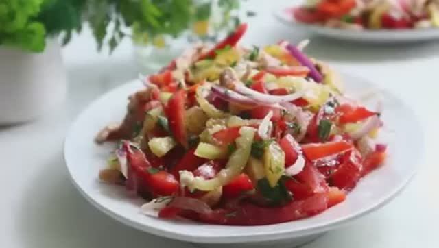 🙄_Подписывайтесь на мой_ Телеграм-канал ► https://t.me/vkucnotak Салат без майонеза. Салат с курицей, овощами и сливой. Интересный и необычный вкус самого обычного салата. Салат овощной с куриным филе. Продукты: куриное филе 1 шт. перец болгарский красный и жёлтый по половинке помидоры маленькие 4 шт. лук красный половинка зелень ( укроп,петрушка,кинза) сливы 4 шт. оливковое масло 4 ст.л. сок лимона по вкусу соль ,перец по вкусу **********************