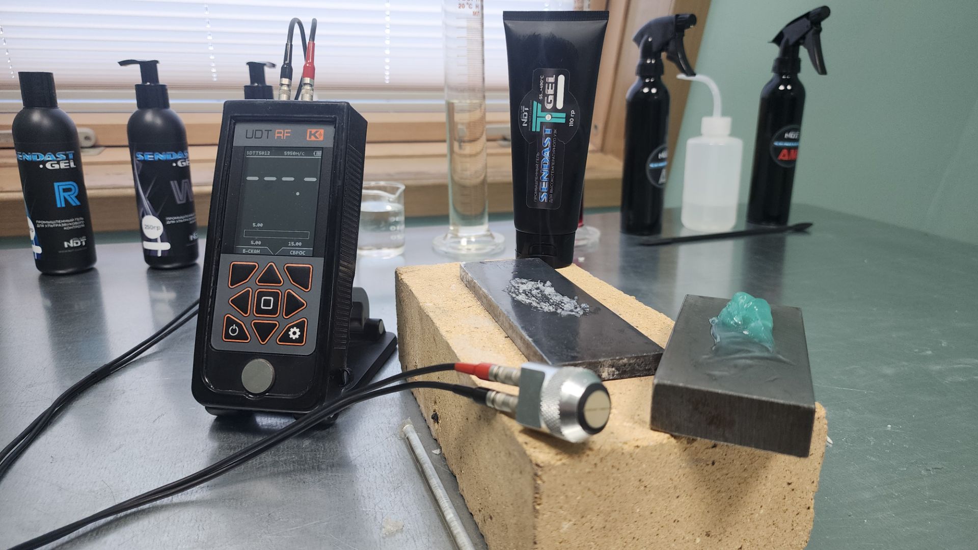 Проведение испытаний промышленного геля для высокотемпературного УЗК SENDAST GEL-T на образце нагретом до 200°С. Измерения проводятся ультразвуковым толщиномером UDT-RF и высокотемпературным преобразователем SENDAST П112-5,0-12/12. Подробная информация на сайте https://www.ndt-club.com/proizvoditeli/ndt-club