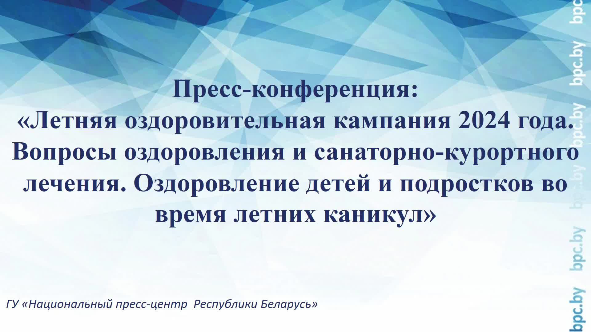 Пресс-конференция: «Летняя оздоровительная кампания 2024 года. Вопросы оздоровления и санаторно-курортного лечения. Оздоровление детей и подростков во время летних каникул» Болбатовский Геннадий Николаевич – Директор Республиканского центра по оздоровлению и санаторно-курортному лечению населения Задать вопрос: vopros@bpc.by Вся самая актуальная и оперативная информация о пресс-мероприятиях Национального пресс-центра Республики Беларусь будет публиковаться на нашем телеграм-канале. Подписывайтесь на нас: https://t.me/s/belpresscenter
