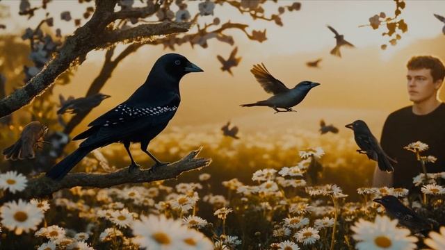 Юноша в ромашковом поле встречает зарю и ищет лепесток любви