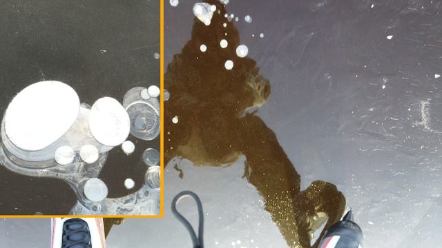 На коньках по прозрачному льду Клязьминского водохранилища. Подмосковье. Прозрачный лёд, видно дно. 4К видео