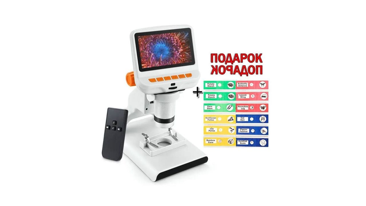 Детский цифровой микроскоп МикроМир А-102 – это биологический световой микроскоп с 1000-ти кратным увеличением, встроенным монитором диагональю 4.3 дюйма, дополнительной подсветкой и записью на microSD карту. В комплект уже входит подарочный набор из 12 биологических препаратов, с помощью которых вы можете ознакомиться с функционалом прибора. Камера производит снимки с разрешением 12 Мп и снимает видео в Full HD качестве. Сохранять полученные снимки и видео с микроскопа можно на microSD карту объемом до 32 Гб. Объектив камеры оснащен восьмью светодиодами. Также в конструкции предусмотрена дополнительная подсветка в основании прибора под предметным столиком. Приятным дополнением для работы является ИК-пульт, который позволит управлять настройками, не касаясь клавиш на мониторе. Благодаря своему исполнению, прибор уверенно стоит на столе. Специальная площадка с зажимами позволит крепко зафиксировать просматриваемый образец. Просмотр изображения с устройства также возможен через ПК, с помощью бесплатной программы Smart Camera. Питание устройства производится с помощью кабеля microUSB - https://recdvr.ru/product/jelektronnyj-svetovoj-mikroskop-mikromir-a-102/