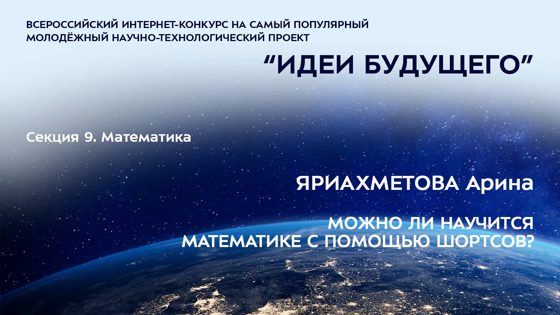 (9-5) ЯРИАХМЕТОВА Арина Ильдаровна Липецкая область, г. Липецк ЦРТ «Левобережный», 8 класс МОЖНО ЛИ НАУЧИТСЯ МАТЕМАТИКЕ С ПОМОЩЬЮ ШОРТСОВ? Научный руководитель: Васильева Алла Павловна, Липецкая область, Липецк, ЦРТ «Левобережный», педагог дополнительного образования Более подробно о мероприятиях Программы "Шаг в будущее" можно узнать на сайтах http://www.step-into-the-future.ru/ и http://шагвбудущее.рф Мероприятия проводятся при поддержке Фонда президентских грантов