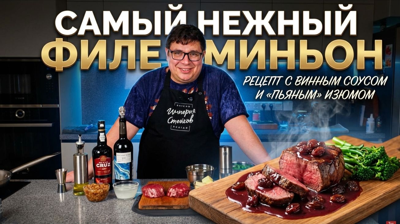 Ищете рецепт идеального романтического ужина? Сегодня готовим — нежнейший Филе Миньон. В этом видео мы не просто пожарим мясо. Я покажу технику приготовления, которую используют в ресторанах со звездами Мишлен. Результат — идеальная равномерная прожарка (Wall-to-wall) без серого кольца. А чтобы блюдо стало настоящим шедевром, мы сделаем к нему насыщенный винный соус с изюмом, вымоченным в коньяке, и подадим с хрустящей стручковой фасолью. Ингредиенты (на 2 порции): Стейки Филе Миньон (вырезка) — 2 шт. Соль, крупный дробленый перец. Оливковое масло. Для соуса: Лук репчатый — 1/2 головки. Красное сухое вино — 0.5 бутылки (выпарить на 2/3). Говяжий бульон (несоленый) — 250 мл. Сливочное масло — 50 г + для жарки лука. Изюм (замочить в коньяке на ночь) — 100 г. Портвейн — 100 мл. Кукурузный крахмал (разведенный) — 2 ст. л. (для загущения). Гарнир: Стручковая фасоль. Лук — 1/2 головки. Чеснок — 2 зубчика. Масло сливочное и оливковое. Понравился рецепт? Ставь лайк и подписывайся на канал "Империя стейков", чтобы не пропустить новые выпуски! Большое спасибо нашим друзьям и партнерам Винотеке Монополь за подбор вин для съемок этого рецепта. #стейк #филеминьон #рецептстейка #какприготовитьстейк #ужин #мясо #кулинария #империястейков