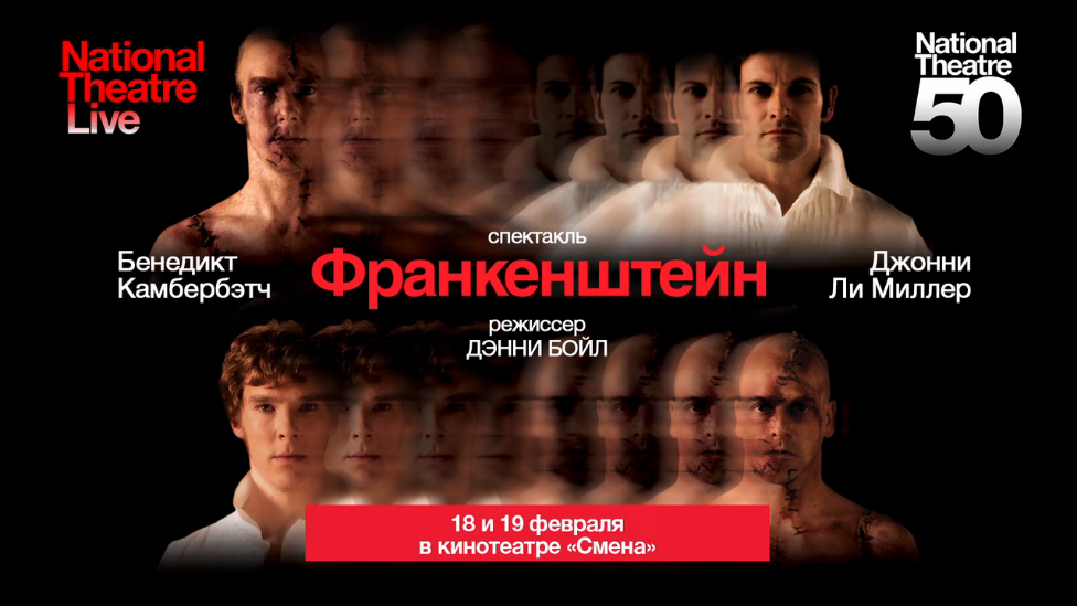В рамках международного проекта «National Theatre Live» в кинотеатре «Смена» г. Киров пройдут показы знаменитого спектакля Дэнни Бойла «Франкенштейн». Демонстрируется в двух вариантах – исполнители ролей доктора и существа меняются местами: - «Франкенштейн: Камбербэтчн» (18 февраля). - «Франкенштейн: Ли Миллер» (19 февраля). Оригинальный звук (английский язык) + русские субтитры.
