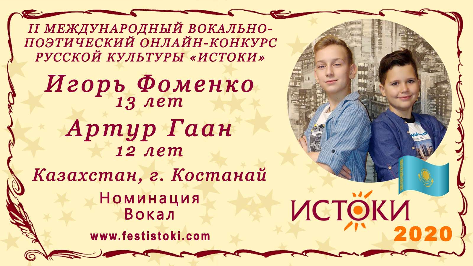 Лауреаты II степени II Международного вокально-поэтического онлайн-конкурса русской культуры «Истоки». Номинация - Вокал. Песня "Песня пилотов" Авторы В.Соловьев-Седой, А. Фатьянов. Сайт: www.festistoki.ru / www.festistoki.com E-mail: festistoki@mail.ru