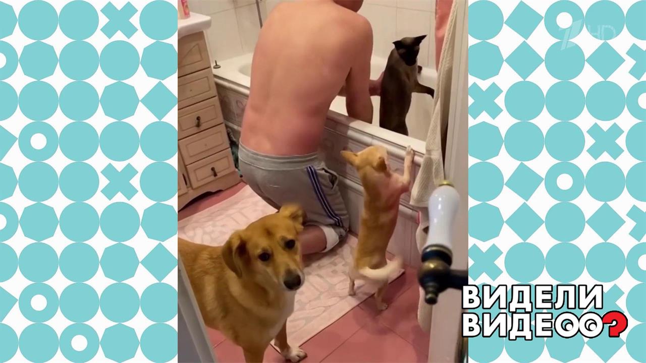 Собаки очень переживают за кота Марселя, которого хозяева вздумали мыть.