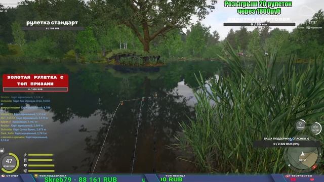 Поддержка донатом https://new.donatepay.ru/@1032463 Альтернативный донат https://www.donationalerts.com/r/kalyamba11 5536913964533059 карта Тинькоф Если стрим лагает,смотри стрим на трово https://trovo.live/s/Kalyamba_na_Ribalke Мой ВК - https://vk.com/kalyantv НИК в игре kalyan11 НАШ ДИСКОРД СЕРВЕР https://discord.gg/4ZzSQkQtsK Заказ водоема на 1 час - 500р ( весь стрим 2500р ) Модерка на канале 1200р ( каждая следующая на 100р больше) Озвучка доната на 40р,50р,100р,200р,300р,500р,1000р ✅Призы в рулетке "ЗОЛОТАЯ" ✔ ЗОЛОТО ✔ ПРЕМ ✔ КАТУШКИ РАПТОР 40, АЗИМУТ 10000, СИЛЬВЕР 80, ТАЙГА с 30 ✔ ПАЛКИ ПИЛКЕРНАЯ, ДОНКА МОРСКИЕ, ✔ РОД ПОД, СТУЛЬЯ ✅Призы в рулетке СТАНДАРТ : ✔ катушка "РАПТОР 40" ✔ катушка "АЗИМУТ 10000" ✔ катушка "ТАЙГА С30, С40," ✔ катушки 60 для медного ( ЭВИИ, НАТОРЫ, ГОЛДА, и тд) ✔ ПИЛКЕРНОЕ УДИЛИЩЕ КОРОЛЕВА ОКЕАНА ✔ Морское Донное удилище ✔ прем ( 3, 7, 30 дней) ✔ золото ( 1, 3, 5, 10, 20 ,50) ✔ билет на море ( 1, 3, 5 дней) ✔ голд наживка и др. ✅Призы в рулетке "СТАРТОВАЯ" ✔ катушка "silver80" ✔ катушка "БЕЛЫЙ КАЛИБР" ✔ катушка "Черный калибр" ✔ катушка "Протон" ✔ катушка "Нарга 6000" ✔ Набор Фидерист и спинингист ✔ Карповик Фортуна ✔ фидерные удилища ✔ прем, золото, алкашка, наживки и тд P.s Рулетка это не казино, а награда за поддержку стримера. Вечный ТОП ПОДДЕРЖКИ (11.05.2024) 1. Dimon_pokemonchik 119 784 2. Interceptor 75 508 3. Skreb79 71 261 4. une personne 68 619 5. Нарвал77 31 550