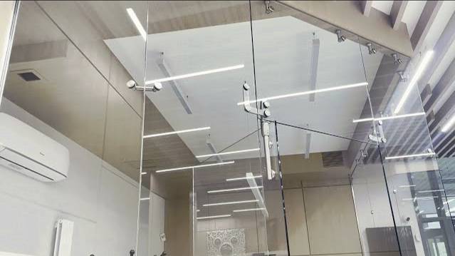 Перегородки и двери из осветленного закаленного стекла для офиса на спайдерном креплении