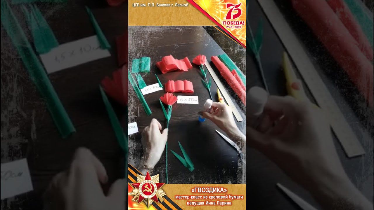 Предлагаем вместе с ведущей Инной Лариной сделать цветок "Гвоздика". Вам понадобится креповая бумага. Эту видеозапись мы посвящаем Дню Победы.
