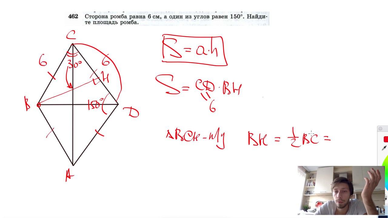 №462. Сторона ромба равна 6 см, а один из углов равен 150°. Найдите площадь ромба. Поддержать канал рублём - 5469400944002125 (Сбербанк) Мой второй канал для подготовки к ЕГЭ и ОГЭ - https://www.youtube.com/ЕвгенийСумин Инстаграм - https://www.instagram.com/EGE_OGE.math Личный инстаграм - https://www.instagram.com/ee_sumin VK - https://vk.com/evgeniysumin FB - https://www.facebook.com/EvgeniySumin