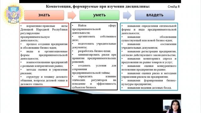 Содержание лекции. 1. Сущность дисциплины. 2. Место дисциплины в программе подготовки. 3. Цель и задачи дисциплины. 4. Предмет дисциплины. 5. Структура дисциплины. Лекцию читает: Кравченко Ю.А., старший преподаватель кафедры экономики предприятия Официальный сайт ДонНУЭТ: http://donnuet.education