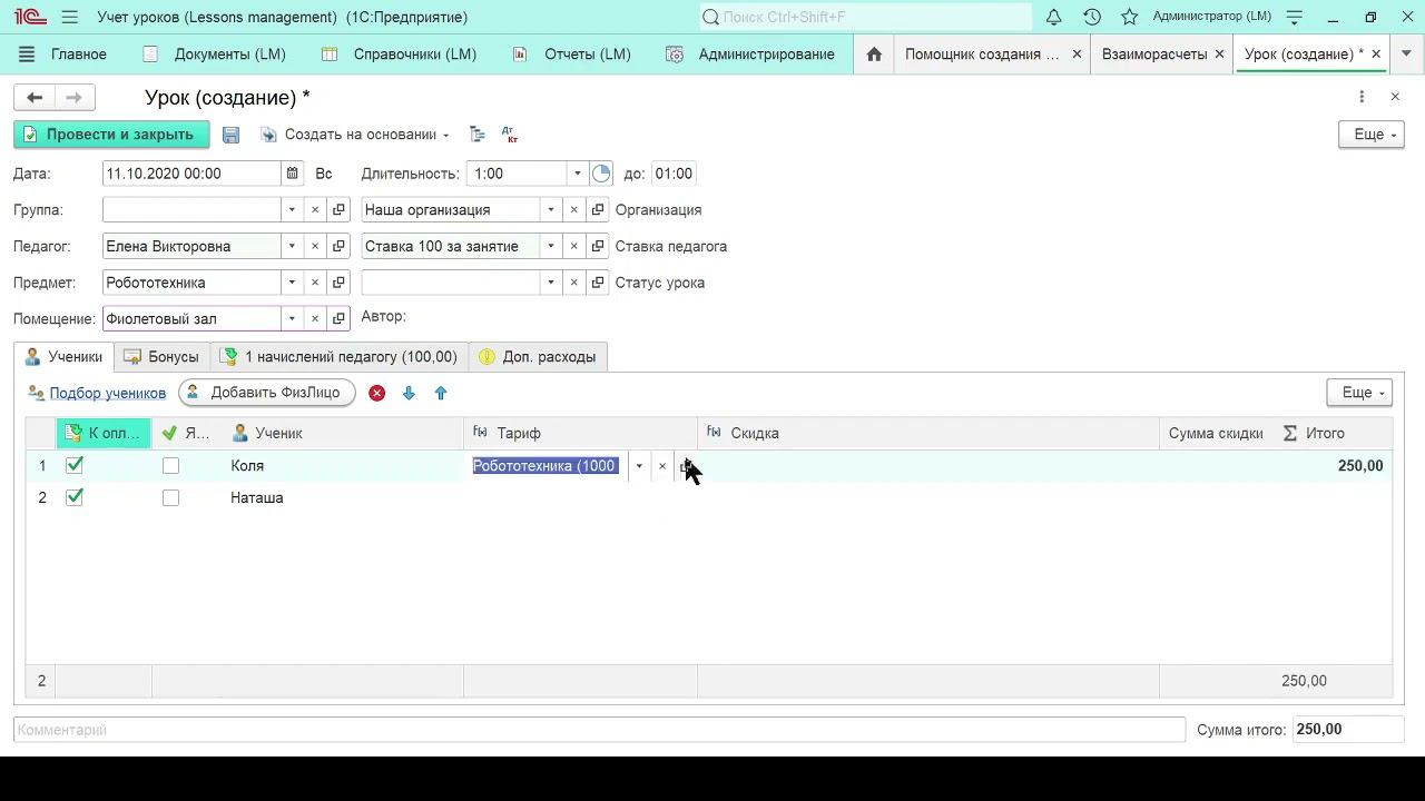 Учет занятий и уроков в 1С: 8.3. Создание одного урока