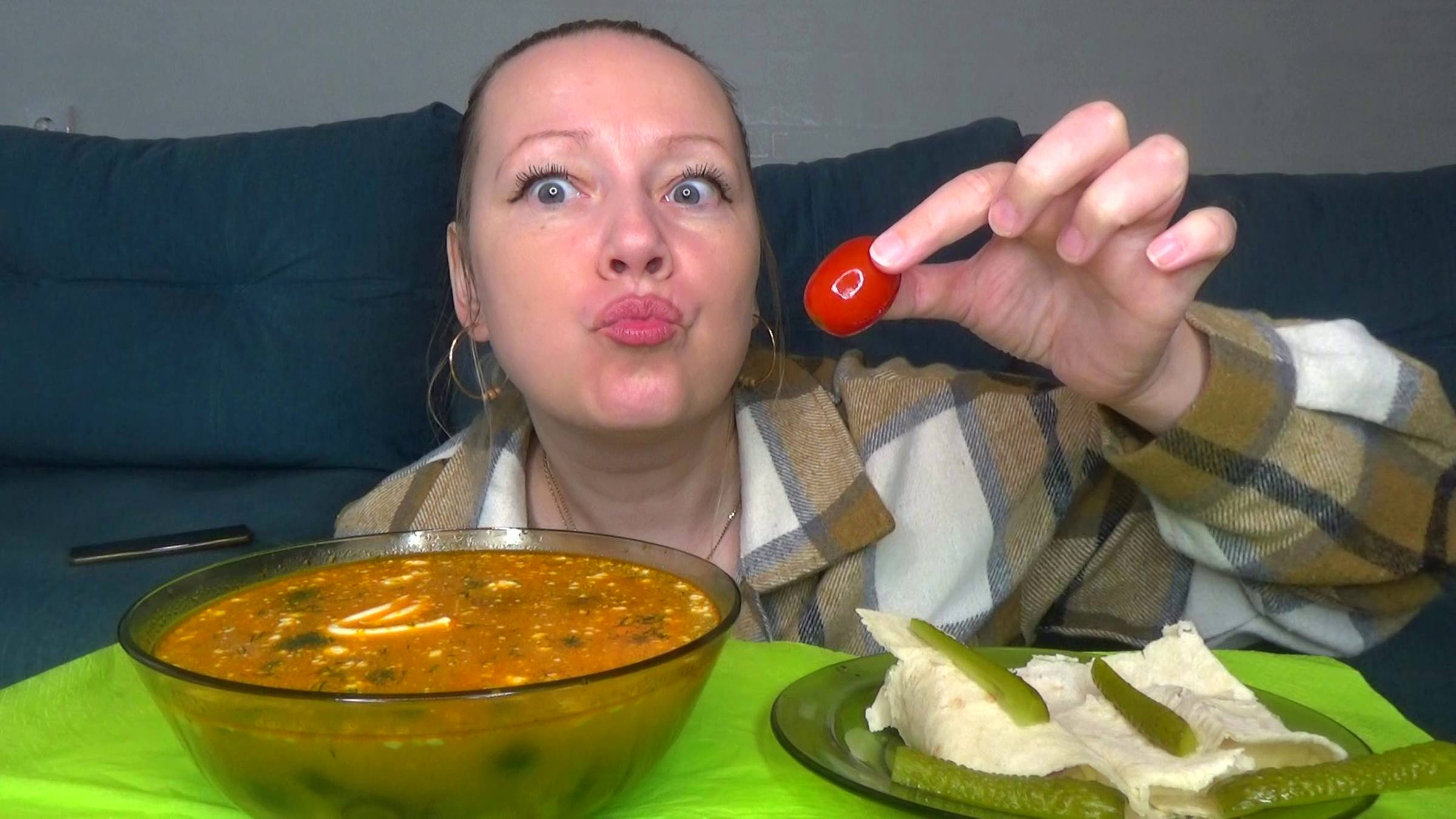 Мукбанг суп солянка кисляк, огурцы соленые, рулетики из лаваша.Еда на камеру.