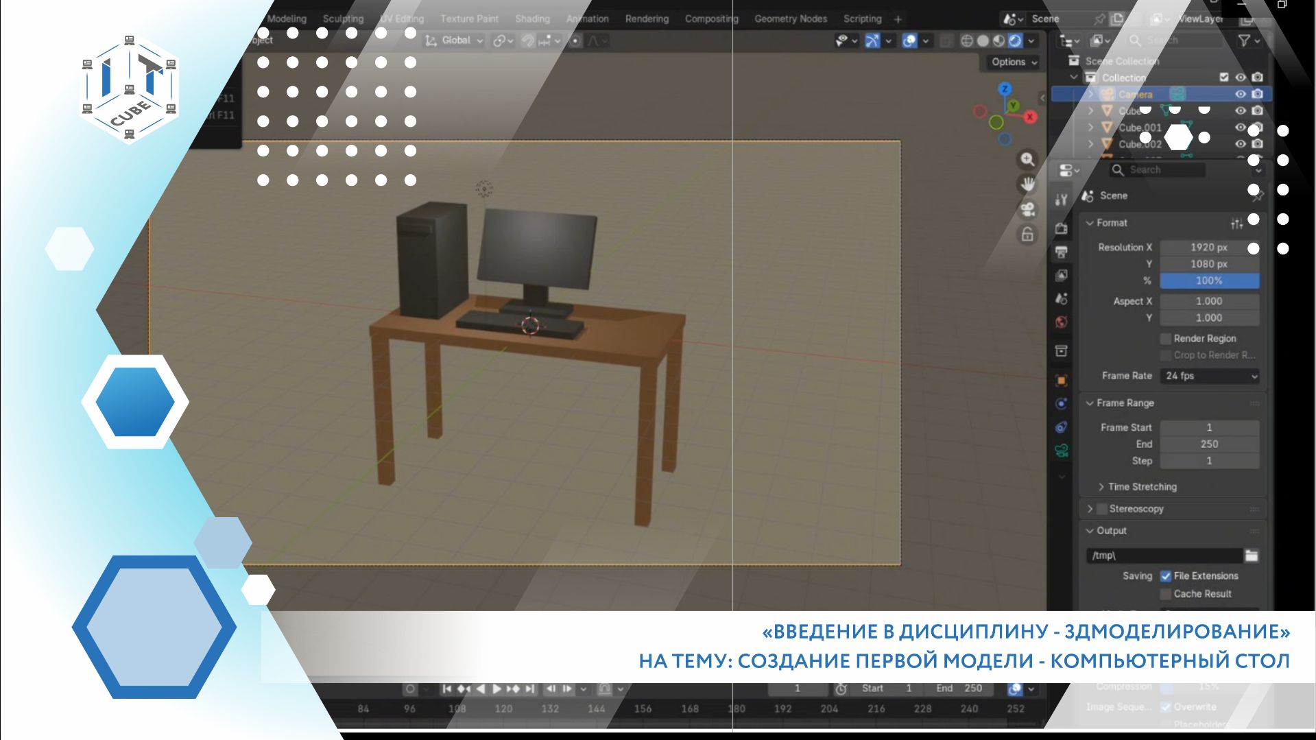 Сегодня свой профориентационный мастер-класс «Введение в дисциплину - в 3D-моделирование” на тему: Создание первой модели - Компьютерный стол, подготовила педагог дополнительного образования Вероника Рыкова. 3D-моделирование сегодня применяется повсеместно: оно лежит в основе современной архитектуры и дизайна интерьеров, используется при создании персонажей и окружения в играх, в инженерном проектировании и производстве рекламных материалов. Понимание принципов работы с 3D-графикой становится важным навыком для специалистов творческих и технических профессий. Данный мастер-класс предлагает погрузиться в мир трёхмерной графики и освоить базовые приемы работы в бесплатном, но функциональном редакторе Blender. Просмотрев мастер-класс, вы узнаете: - Базовый интерфейс программы; - Как ориентироваться в сцене; - Как создавать, изменять и перемещать объекты; - Как покрасить свою модель, поставить освещение и сделать рендер. Основная часть мастер-класса посвящена практическому моделированию: каждый слушатель сможет создать модель компьютерного стола, закрепив полученные знания и получив готовый результат. Центр цифрового образования IT-куб. Хабаровск (ЦТЦО "ТЕХНО-IT-куб")