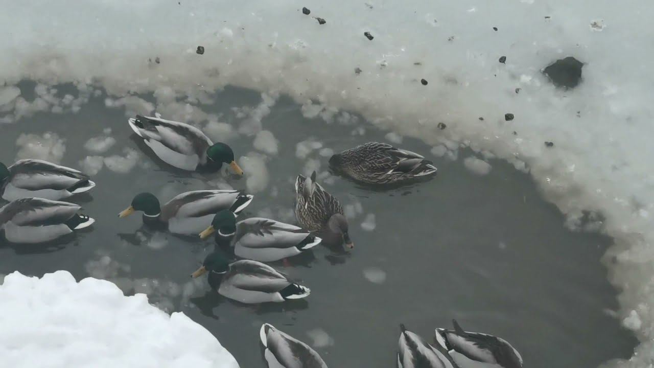 Уточки не успели улететь а полынья замёрзла