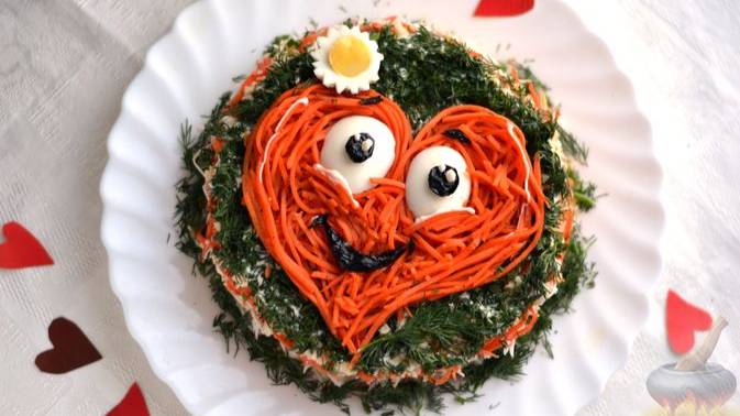 Очень вкусный слоёный салатик из крабовых палочек, сыра и моркови по-корейски ко Дню влюблённых. Блюдо, оригинально украшенное улыбающимся сердцем, создаст хорошее настроение на весь праздничный день. #Салат #СалатПраздничный #СалатНаДеньВлюблённых #СалатПраздничный