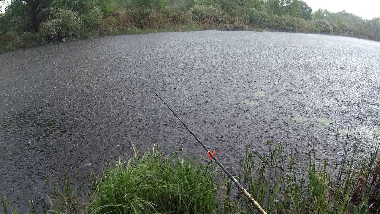 Рыбалка на небольшом озере под дождём и грозой